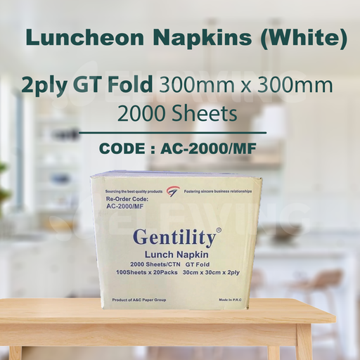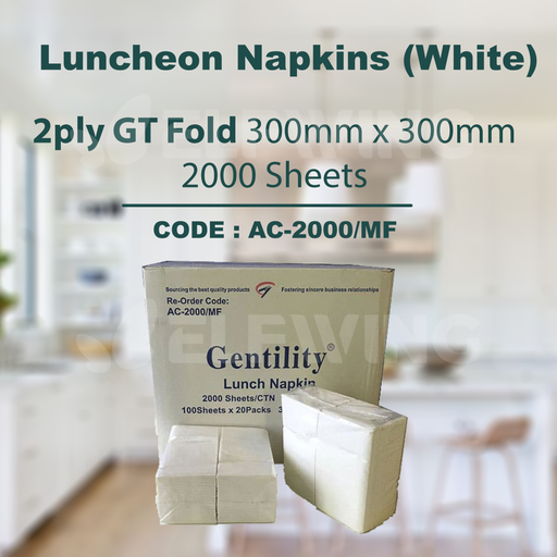 $52.00| /A&C AC-2000/MF AC-2000/W Luncheon Napkins GT Fold/Q-Fold 2ply 300mm x 300mm 2000 Sheets (White)Contact us if you need to buy it in pallets. AC-2000/MF Luncheon Napkin, GT Fold AC-2000/W Luncheon Napkin, Quater Fold Strong Strong even wh... View full details$52.00| /Sold out