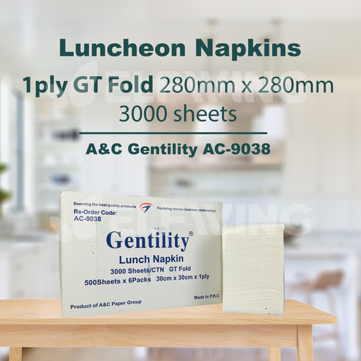 $40.00| /A&C AC-9030 AC-9038 Luncheon Napkins Q-Fold/GT Fold 1ply 280mm x 280mm 3000 Sheets (White)Contact us if you need to buy it in pallets. Package details Quater Fold (AC-9030); GT Fold (AC-9038); White colour; 1 ply; 28cm x 28cm; 500 shee... View full details$40.00| /Sold out